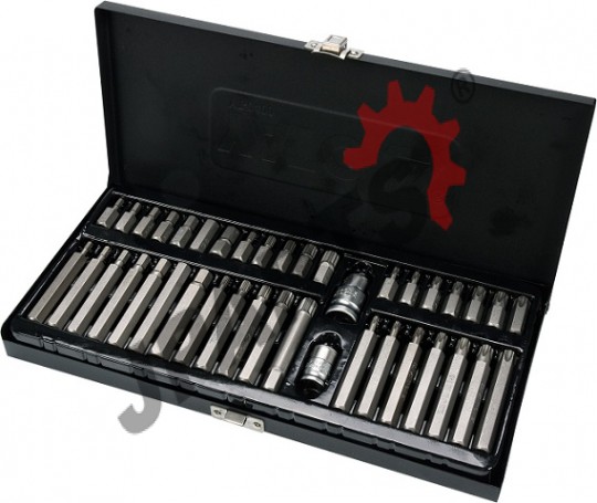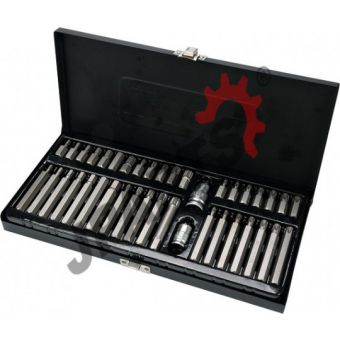 Profesjonalny zestaw bitów, służący do odkręcania śrub specjalnych typu: torx, spline, hex. Wykonany z najwyższej jakości stali stopowej narzędziowej S2, która charakteryzuje się wysoką twardością HRC 58-62, jednolitą, drobnoziarnistą strukturą materiału, odpornością na skręcanie, wysokim momentem dokręcania, doskonałym zahartowaniem. Różnorodność bitów zapewnia możliwość wykonania wielu prac w specjalistycznych serwisach mechanicznych i samochodowych.