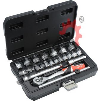 Profesjonalny zestaw narzędziowy, który został opracowany pod kątem potrzeb wyspecjalizowanych serwisów samochodowych i mechanicznych. Klucze nasadowe, jak i napęd nasadek, zostały wykonane z wytrzymałej, narzędziowej stali chromowo-wanadowej CrV 50BV3. Nasadki wyposażone w system AS-Drive, zwiększający maksymalny moment o 25%, przy pełnej ochronie obrzeży nakrętek, nasadki z dwutonowym wykończeniem powierzchni. Nasadki wykonano metodą kucia matrycowego, a przed procesem hartowania poddano je kalibracji za pomocą precyzyjnych przymiarów i urządzeń kontrolnych. Zestaw umożliwia pracę wymagającą bardzo dużych obciążeń i precyzji, pozwala wykonywać wiele czynności serwisowych związanych z odkręcaniem i przykręcaniem połączeń gwintowych o różnych rozmiarach nominalnych. Grzechotka posiada trójkomponentową rękojeść oraz 72 zęby (skok roboczy 5 stopni).