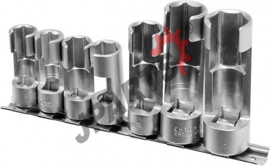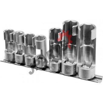 7-elementowy zestaw nasadek otwartych 3/8” oraz 1/2”. Stosowany ze specjalistycznymi kluczami nasadowymi do odkręcania przewodów paliwowych, czujników temperatury, wyłączników termicznych, sond lambda i innych elementów posiadających kable.