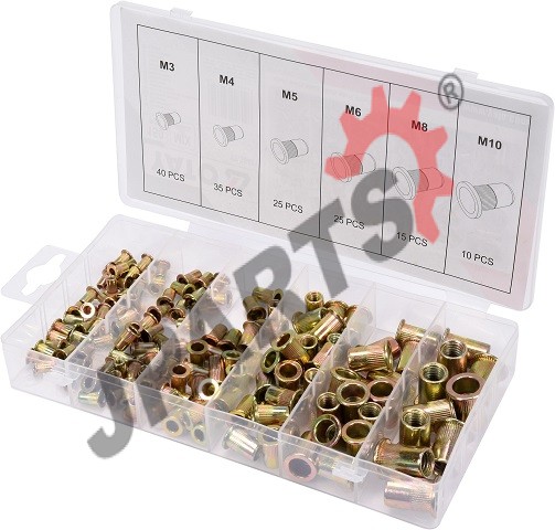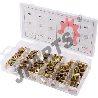Zestaw stalowych nitonakrętek M3-M10 marki YATO YT-36481. Kołnierz walcowy, radełkowany, dzięki czemu ściślej przylega do mocowanego elementu.