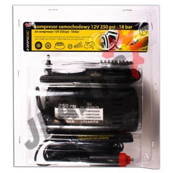 Zasilany z gniazda zapalniczki 12V lub z dodatkowego gniazda zasilania 12V w samochodzie. Kompresor wyposażony w manometr do kontroli ciśnienia.