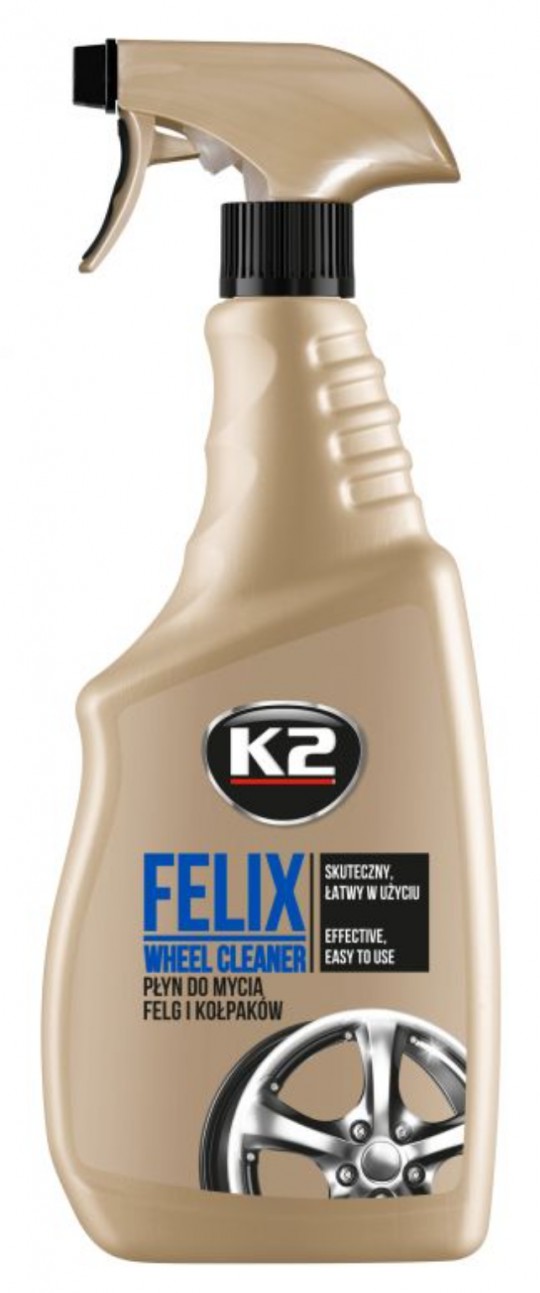 K2 FELIX to skuteczny płyn do mycia wszystkich rodzajów felg. Najlepiej spisuje się przy regularnym czyszczeniu obręczy. Jego formuła dokładnie myje felgi z osadów powstałych przez pylenie klocków hamulcowych i zanieczyszczeń drogowych. K2 Felix penetruje wszystkie szczeliny i wgłębienia w feldze, rozpuszczając znajdujący się w nich osad i nadając feldze połysk.