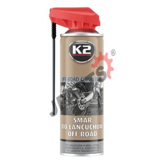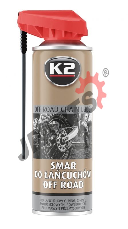K2 Smar do łańcuchów OFF-ROAD - to wysoce wydajny smar, przeznaczony do smarowania łańcuchów oraz zębatek napędowych w motocyklach terenowych oraz quadach. Dzięki właściwościom smarująco-penetrującym, wnika we wszystkie szczeliny, chroniąc łańcuch oraz zębatki przed przedwczesnym zużyciem. Można go stosować we wszystkich typach łańcuchów, x-ring, o-ring, z-ring itp.