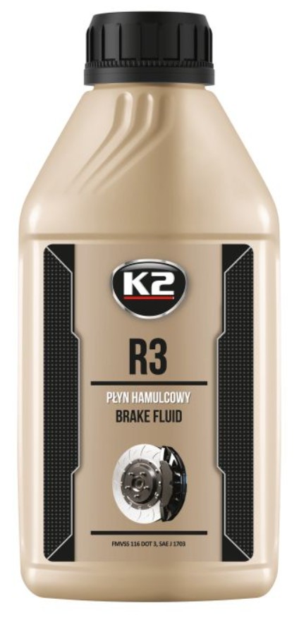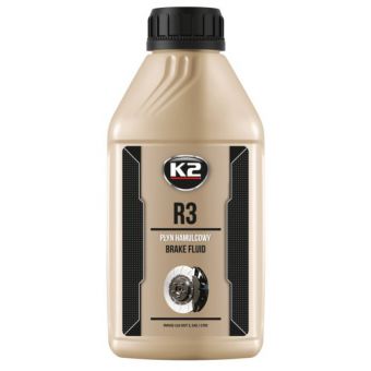 K2 R3 to w pełni syntetyczny najwyższej jakości płyn hamulcowy o temperaturze wrzenia pow. 240 st. C. Płyn hamulcowy R3 stosowany jest w samochodowych układach hamulcowych. Jest przeznaczony do wymiany i uzupełnienia płynu we wszystkich pojazdach, gdzie instrukcja obsługi nakazuje stosowanie płynu R3 lub DOT3.