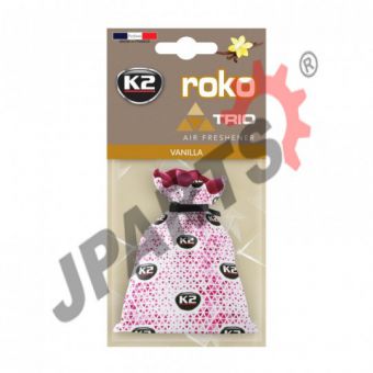 K2 ROKO TRIO to odświeżacz powietrza w woreczku z unikatową grafiką. Bawełniany woreczek zauroczy Ciebie i Twoich pasażerów. Każdy z 6 odświeżających zapachów pozwoli poczuć się wyjątkowo, a kolorowy wzór graficzny rozświetli wnętrze Twojego auta.