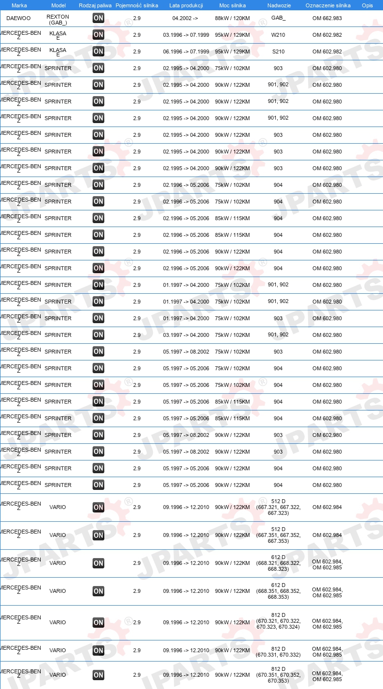 | Konstrukcja świec żarowych: | świeca żarowa metalowa |